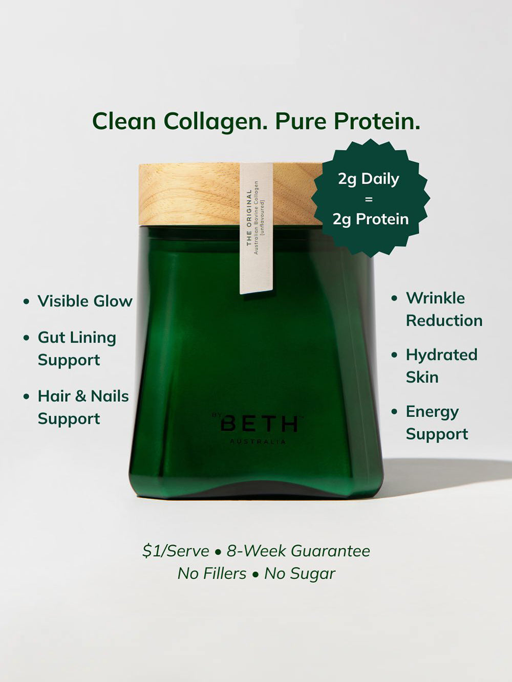Dull skin, stubborn bloat, “nothing works” fatigue? Most powders hide sugars, flavours and fillers that irritate the gut and inflate serving sizes. By Beth Fruit + Floral is different: hydrolysed bovine collagen (Types I & III) from pasture-raised Australian cattle, vitamin-C–rich native botanicals (Quandong, Muntries, Strawberry Gum) to support collagen formation, and a naturally pink, lightly sweet finish—no fillers, no added sugar, no sugar alcohols. Just 2 g a day of pure protein your body can use.