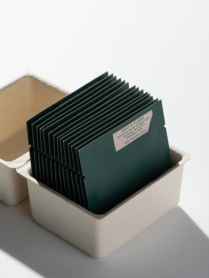 14 single-serve sachets of hydrolysed collagen for on-the-go glow — pre-measured 2g portions, sealed for freshness, effortless to pack, and perfect when your ritual leaves the house.
