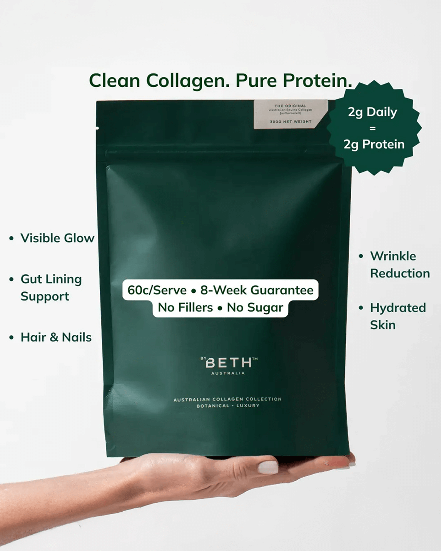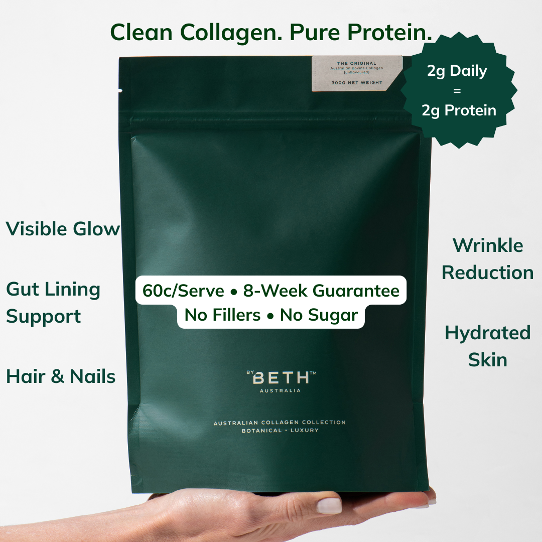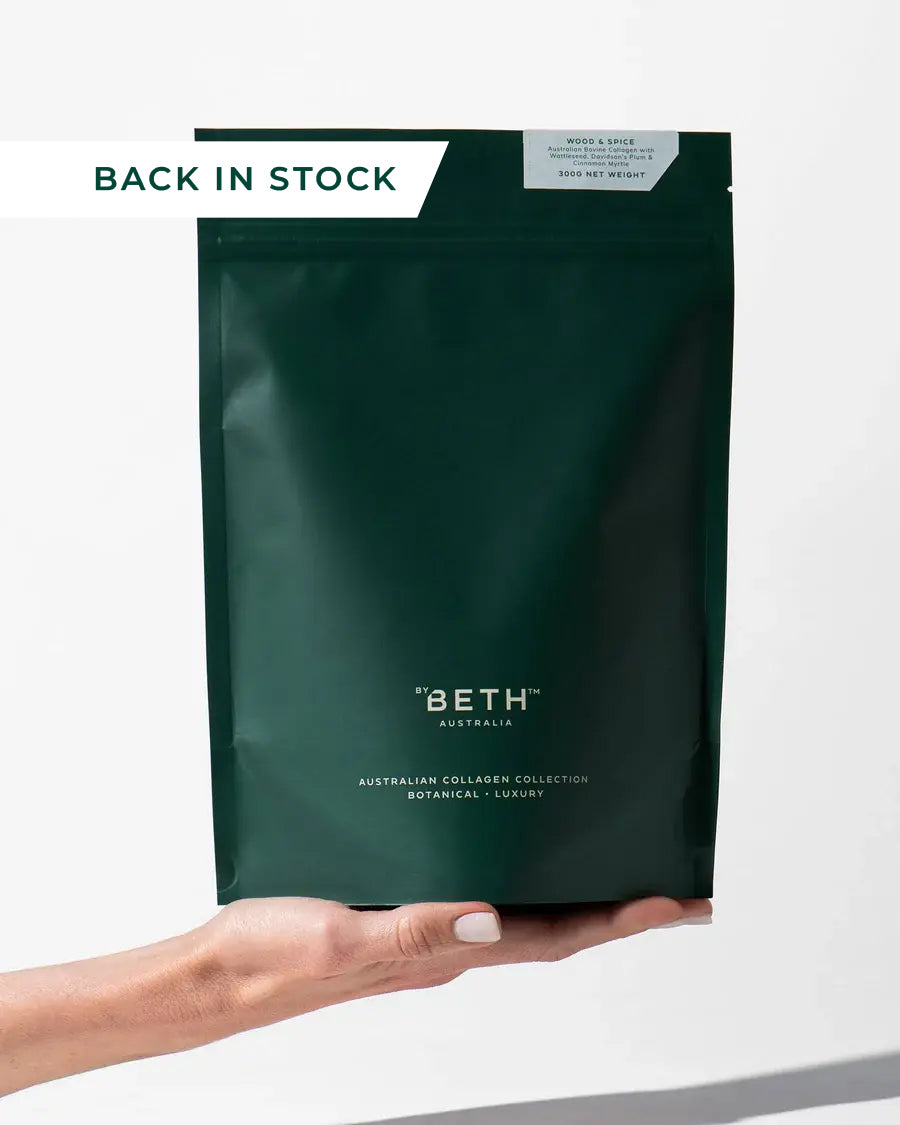 Experience a harmonious blend of 100% Australian bovine collagen and potent native botanicals—Wattleseed, Davidson’s Plum, and Cinnamon Myrtle. This formula is rich in natural Vitamin C, a vital nutrient that not only brightens skin and supports collagen production but also helps protect against premature ageing.