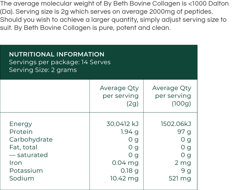 100% Australian Bovine Collagen: ethically sourced from grass-fed, pasture-raised Australian cattle.
